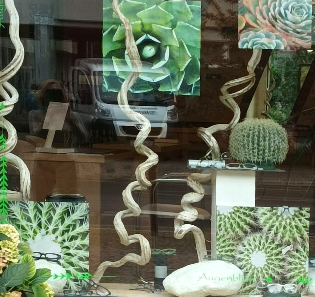 Frühlingshafte Schaufensterdekoration für den Augenoptiker Röseler in Berlin Prenzlauer Berg. Die grossen Tulpen sind auf einer farblich gestalteten Hartfaserplatte gemalt, mit Rahmen eingefasst und Winkeln versehen, so dass die Tulpenbilder gut im Schaufenster stehen. Die Tulpenbilder sind ein toller Blickfang und ziehen die Blicke der Passanten schon beim Einbau der Schaufensterdekoration auf sich.