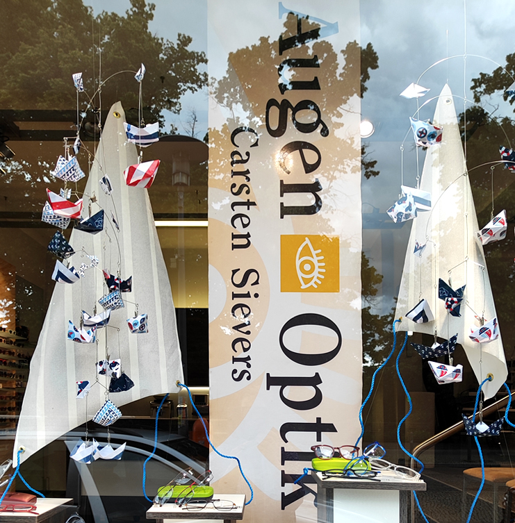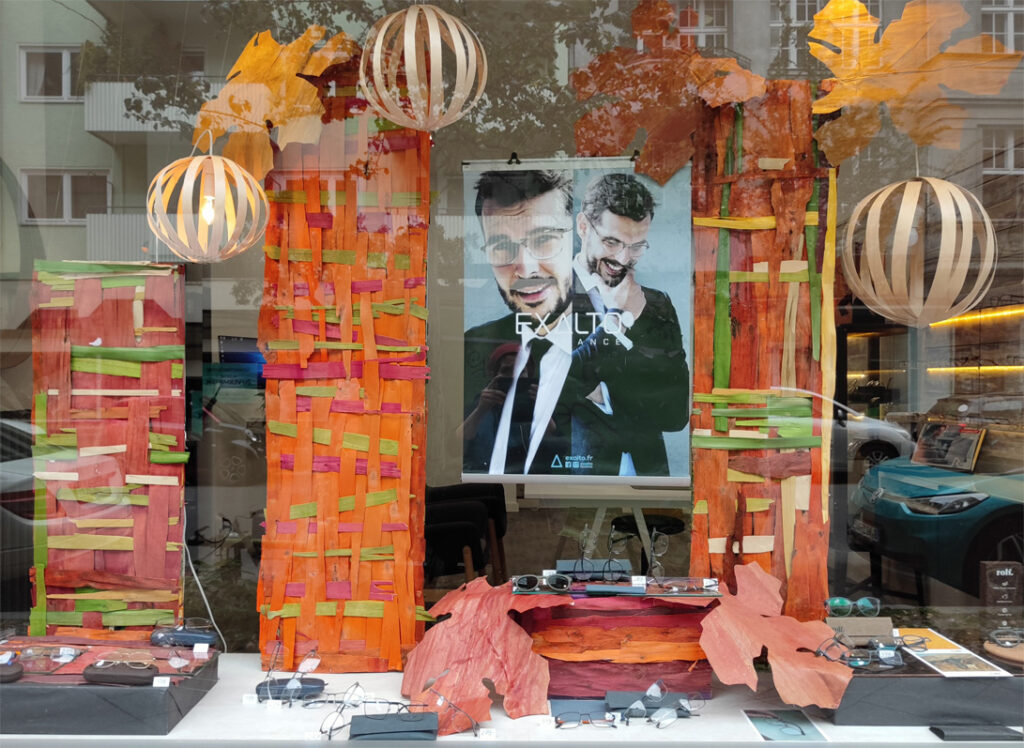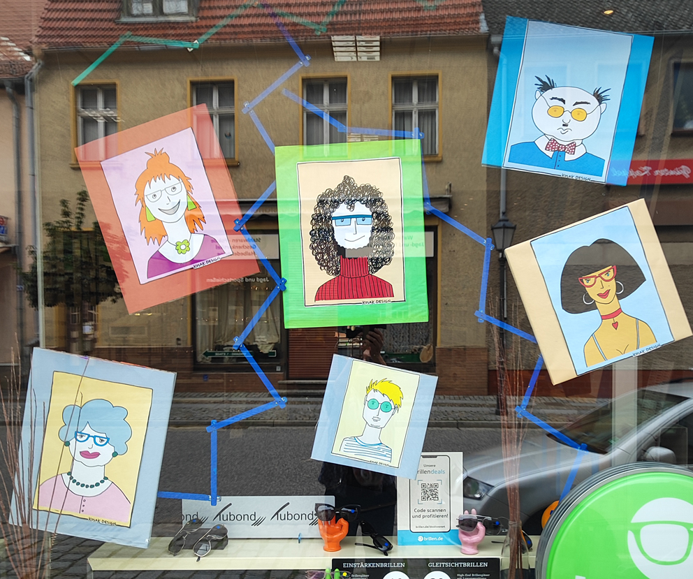 Frühlingshafte Schaufensterdekoration für den Augenoptiker Röseler in Berlin Prenzlauer Berg. Die grossen Tulpen sind auf einer farblich gestalteten Hartfaserplatte gemalt, mit Rahmen eingefasst und Winkeln versehen, so dass die Tulpenbilder gut im Schaufenster stehen. Die Tulpenbilder sind ein toller Blickfang und ziehen die Blicke der Passanten schon beim Einbau der Schaufensterdekoration auf sich.